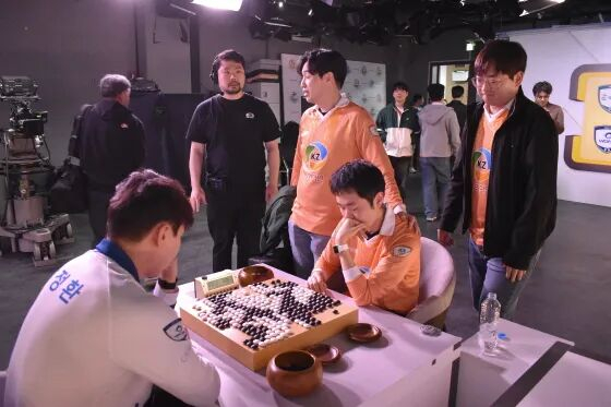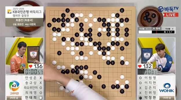 ▲ 陷入争议的冠军争夺战第三局决胜第五局终局画面。朴廷桓九段(右侧棋手)战胜韩态熙九段,为元益队拿下建队以来首个冠军。